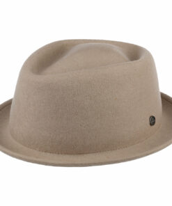 Timeless and with no-frills, this compact pork pie with diamond-shaped crown knows how to impress. The narrow-brimmed hat is made of crushable and water-repellent wool felt and will win you by its appearance and also its complete functionality. Entirely without grosgrain ribbon trim and brand pin, the small wool hat certainly has the makings of a classic.