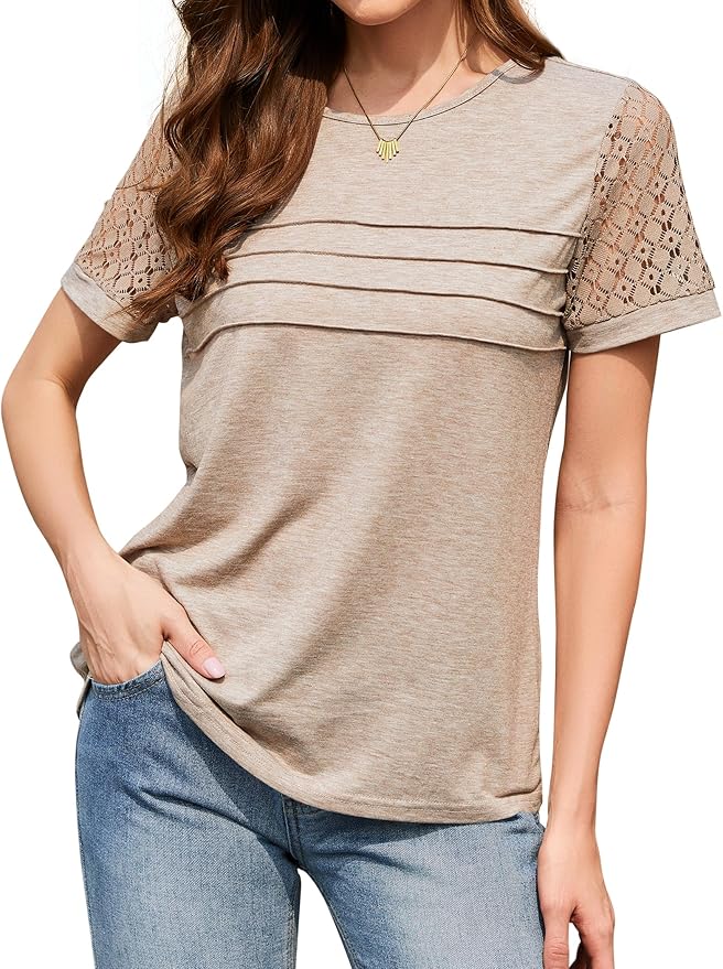 - Women’s tops made with soft rayon-polyester-spandex blend for breathable stretch comfort. Features lace sleeve, crew neck and loose fit design that suits all bodies, great for dressy casual to beach vacation outfits