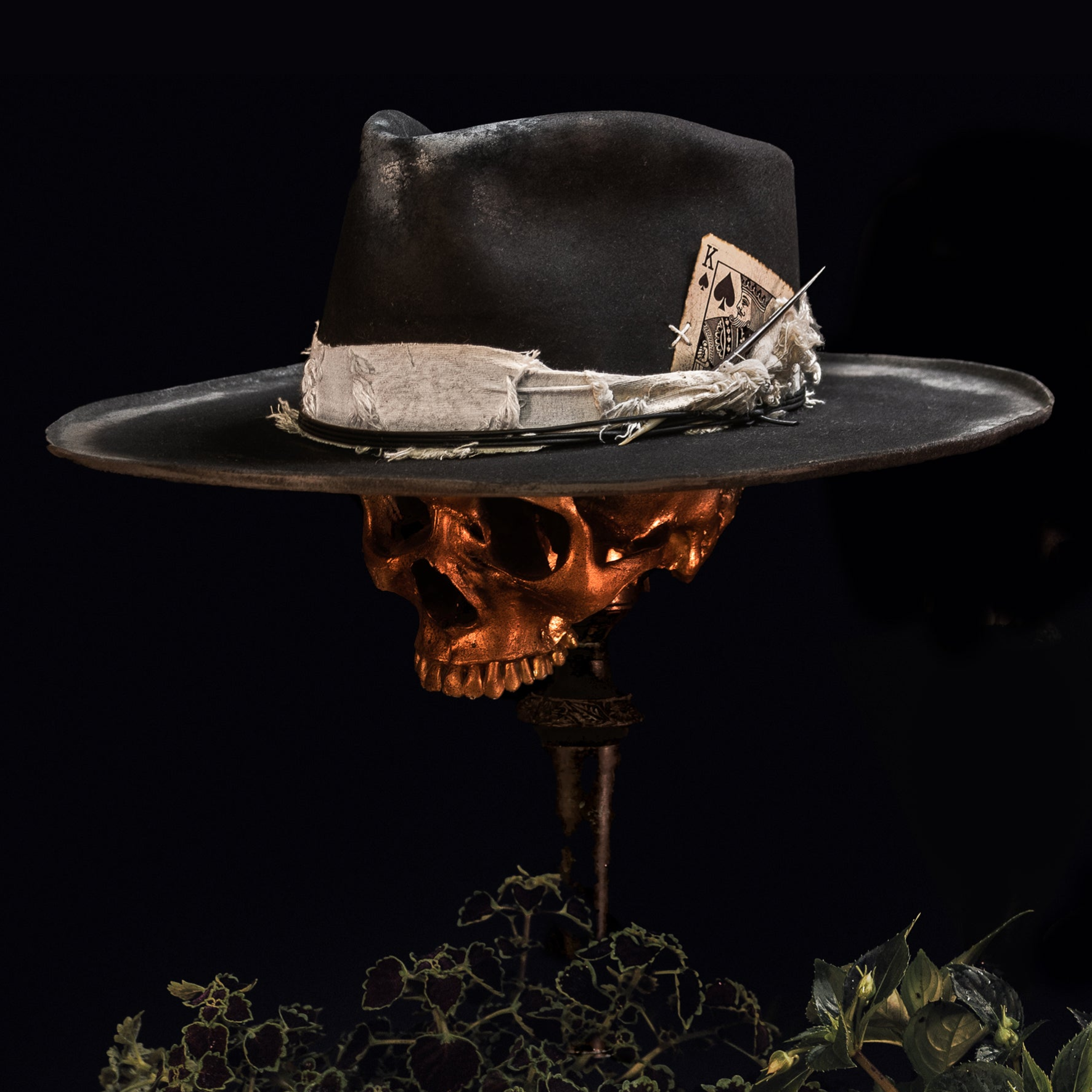 Made from our premium western weight hare felt, black. This teardrop hat with micro curls features silver gilt patina and features a custom Coup of Life card, white jacquard linen wrap, black triple leather rope detail and South African porcupine quill.