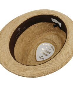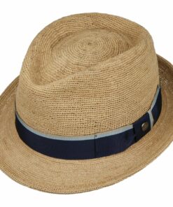 Raffia straw is the material of choice for this trilby, which has a chunkier texture and is light and airy for the summer. The natural-looking plain colour is given a jaunty touch by the brim that stands up boldly at the back, the dented crown and the striped grosgrain ribbon trim band, which casually complements outfits on holiday and at home.