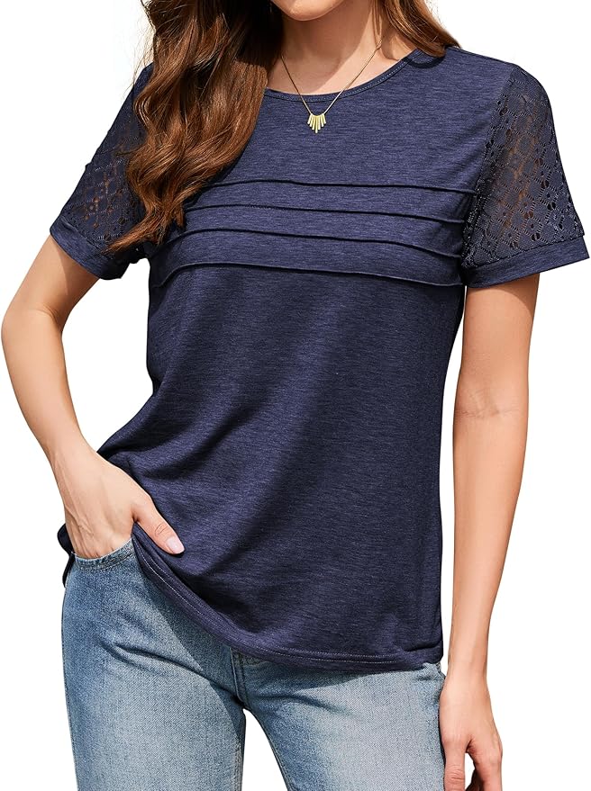 - Women’s tops made with soft rayon-polyester-spandex blend for breathable stretch comfort. Features lace sleeve, crew neck and loose fit design that suits all bodies, great for dressy casual to beach vacation outfits