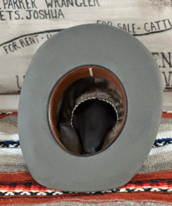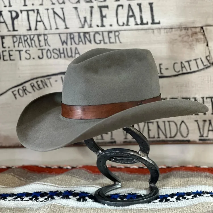 It has a low profile Gus creased crown that is 4.75″ in the back and slopes to 4.25″ in the front. The 3.75″ brim has a small pencil curl on the sides and a nice slope in the front and back. It is topped off with an antique looking leather hat band. We really like this one with its unique look and versatility.