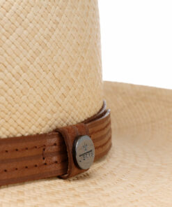 This fedora has a stately appearance to it. Made from plain-coloured Panama straw, it has summery properties that are supported by a partial lining made of cotton that is kind to the skin. To round off its proud appearance, the fedora is encircled by a leather trim with a brand pin on the side. The straw hat enhances outfits with its refined touch and stylishly complements elegant attire.