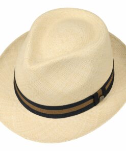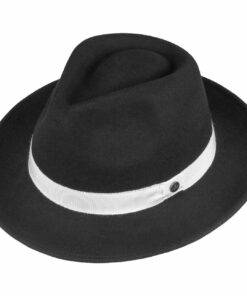 Supple wool felt gives this hat its pleasant feel and, together with a skin-friendly lining made of cotton, makes it comfortable to wear. The plain design of the felt hat with narrow brim is complemented by a subtly striped grosgrain ribbon trim with brand pin, which emphasises the hat’s neat charm. This trilby can be worn on everyday outings, but also makes a great club hat.